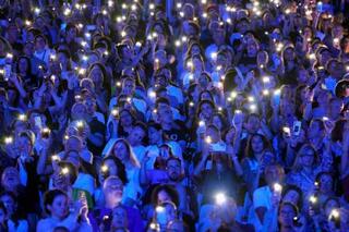 イスラム組織ハマスの奇襲から2年となった7日、イスラエル中部テルアビブで開かれた大規模イベントで犠牲者を悼む人たち(共同)
