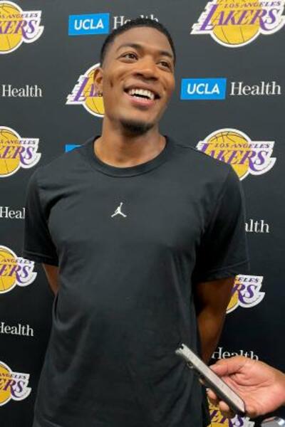 取材に応じるレーカーズの八村=7日、エルセグンド(共同)