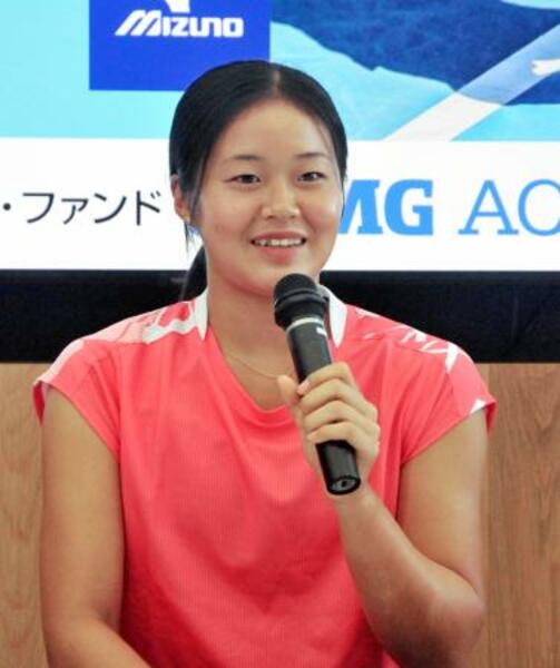 記者会見する女子テニスの園部八奏=8日、大阪市住之江区