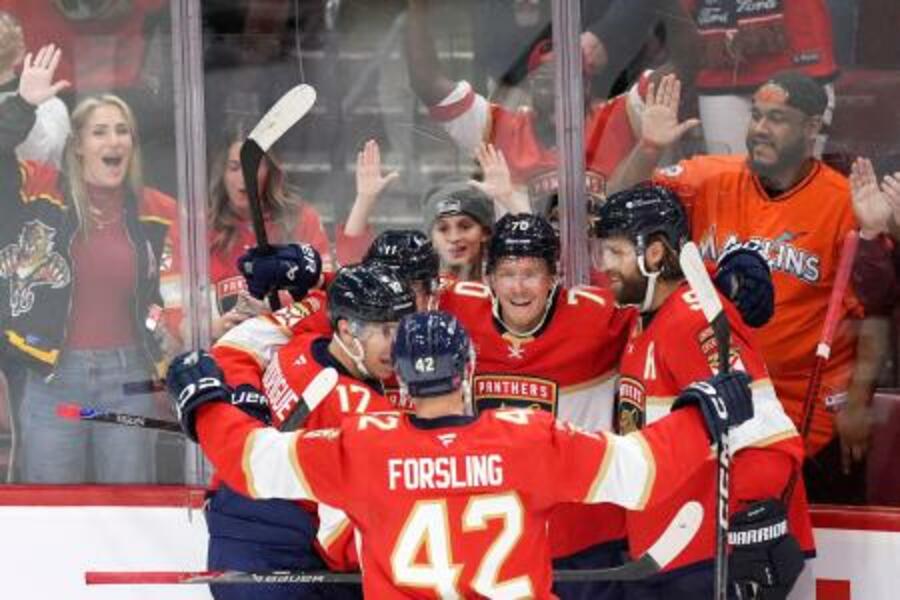 ブラックホークス戦で勝ち越し点を挙げ、チームメートと喜ぶパンサーズのボクビスト(中央)=サンライズ(AP=共同)