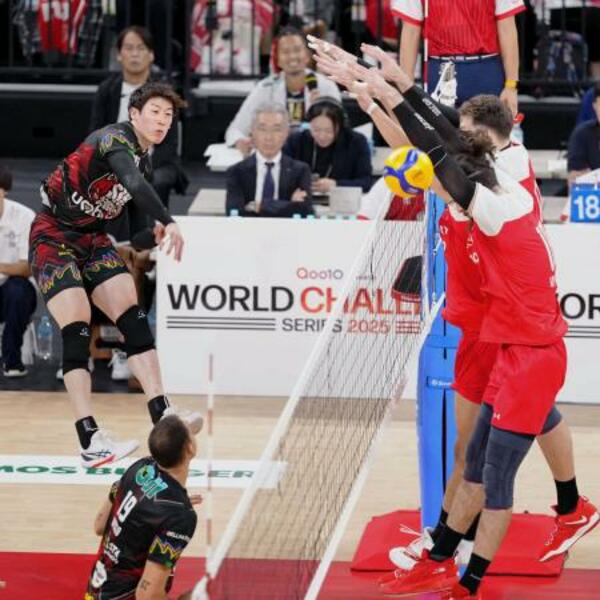 サントリー戦でスパイクを放つペルージャの石川(左)=有明アリーナ(代表撮影)