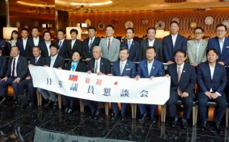 台湾出発を前に、記念写真に納まる超党派の議員連盟「日華議員懇談会」のメンバーら=9日午前、羽田空港