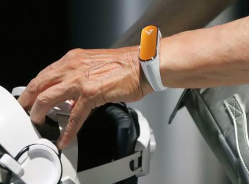 血圧を常時測定できる手首装着型の小型機器=8月、大阪市此花区の夢洲