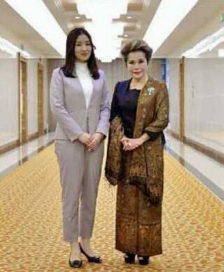 北朝鮮の朝鮮労働党創建80年の関連行事に参加するため、平壌に到着したデヴィ・スカルノ氏(右)。10日付の労働新聞が掲載した(コリアメディア提供・共同)
