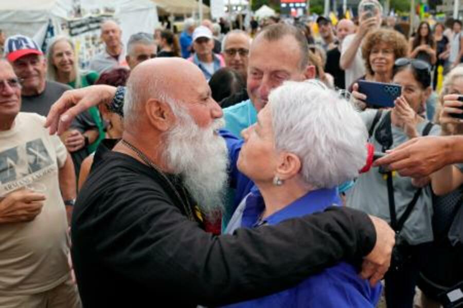 9日、イスラエル中部テルアビブで喜ぶ、息子がハマスに拘束されたダニ・ミランさん(左)(共同)