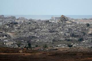 9日、破壊されたパレスチナ自治区ガザ北部=イスラエル南部スデロトから撮影(共同)