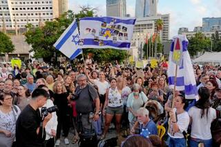 イスラエル中部テルアビブで、パレスチナ自治区ガザの和平計画の「第1段階」合意が報じられ、喜ぶ人たち=9日(共同)