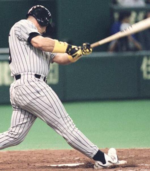 1997年5月10日の巨人戦で、自打球を右足甲に当てた阪神時代のグリーンウェルさん=東京ドーム
