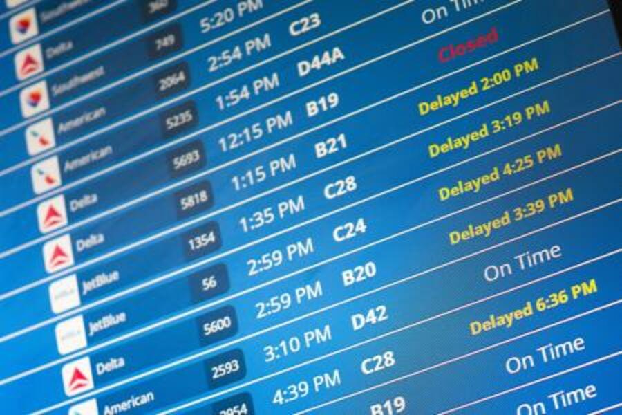 旅客便の遅延が目立つ米空港の掲示板=8日、ワシントン近郊(ロイター=共同)