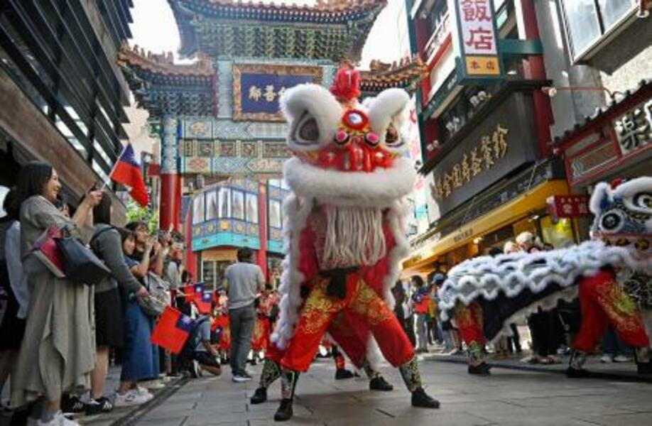 横浜中華街を練り歩く獅子舞=10日午後、横浜市