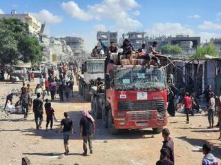 停戦合意を受け運び込まれる人道支援物資=12日、ガザ南部ハンユニス(アナドル提供・ゲッティ=共同)