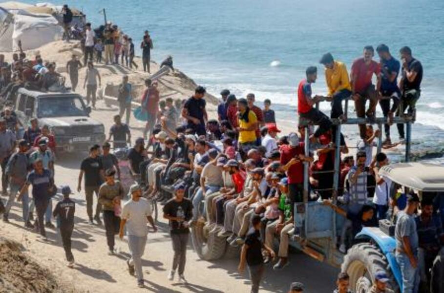 停戦を受け、避難先のガザ南部から北部に戻る人たち=10日、ガザ中部(ロイター=共同)