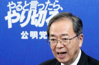 自民党の高市総裁との会談後、記者会見する公明党の斉藤代表=10日午後、国会
