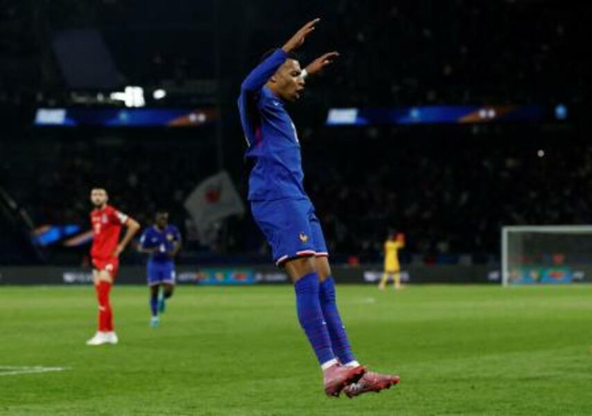 W杯欧州予選のアゼルバイジャン戦で先制ゴールを決め、喜ぶフランスのキリアン・エムバペ=10日、パリ(ロイター=共同)