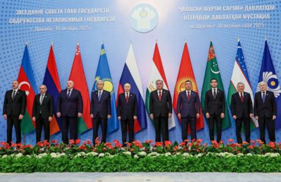 10日、タジキスタン・ドゥシャンベで開催されたCIS首脳会議で、記念撮影するロシアのプーチン大統領(左から5人目)ら参加者(タス=共同)