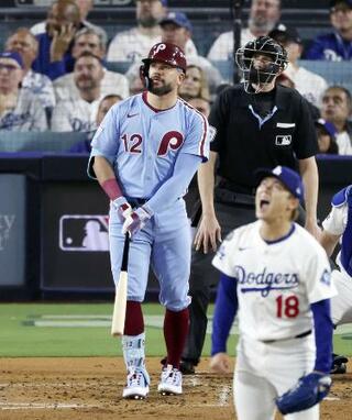 ドジャース戦の4回、先発山本から本塁打を放つフィリーズのシュワバー=ロサンゼルス(共同)