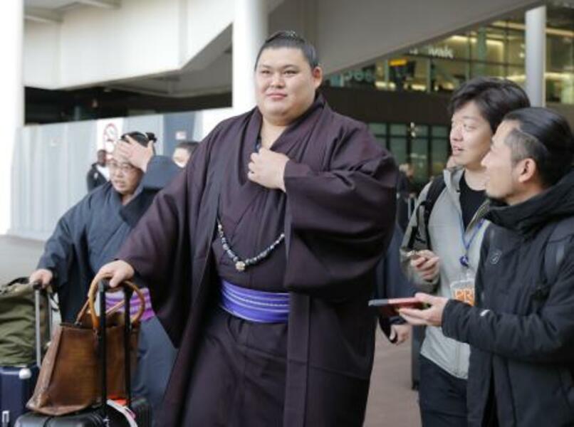 大相撲のロンドン公演のため、英ヒースロー空港に到着した横綱大の里=11日、ロンドン(共同)