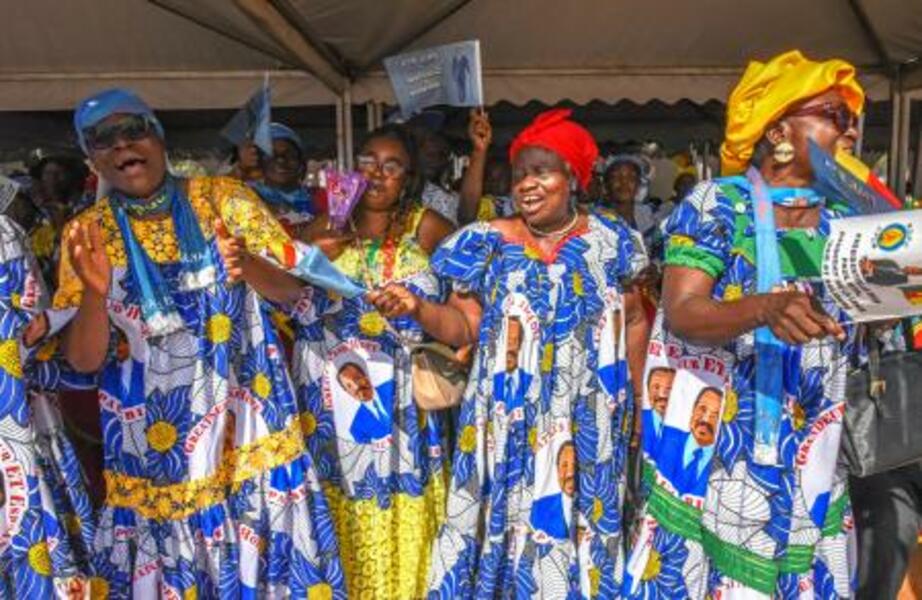 カメルーン中部モナテレで開かれた集会で、ビヤ大統領を応援する人々=11日(中野智明氏撮影・共同)