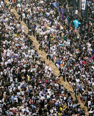 那覇市中心部の国道58号で行われた沖縄県の伝統行事「那覇大綱挽」=12日午後