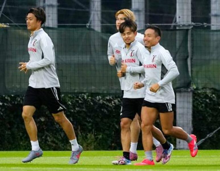 ブラジル戦に向け、調整する長友(右端)ら=千葉市内