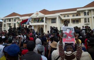 マダガスカル軍の車両を取り囲むデモ参加者=11日、アンタナナリボ(ロイター=共同)