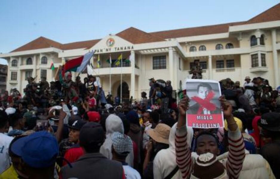 マダガスカル軍の車両を取り囲むデモ参加者=11日、アンタナナリボ(ロイター=共同)