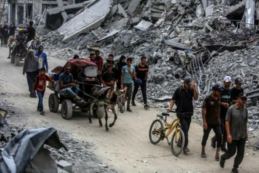 停戦合意発効を受け、自宅に戻るため破壊された建物の間を移動するパレスチナ人ら=12日、ガザ南部ハンユニス(ゲッティ=共同)