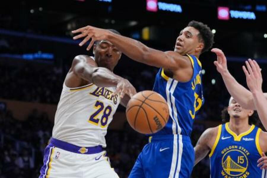 ウォリアーズとのオープン戦でルーズボールを競り合うレーカーズの八村塁(左)=12日、ロサンゼルス(AP=共同)