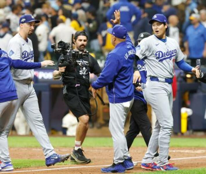 ブルワーズに勝利し、ロバーツ監督とタッチを交わすドジャース・大谷(右)=ミルウォーキー(共同)