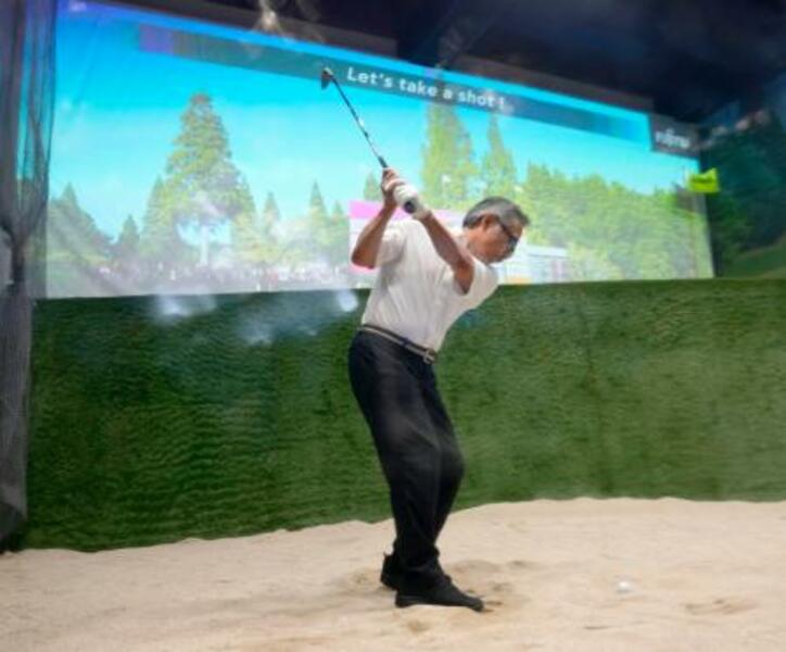 富士通が設置した、ゴルファーのスイングをAIで分析、上達に向けたアドバイスをする技術のブースでバンカーショットを放つ来場者=14日午前、千葉市美浜区の幕張メッセ