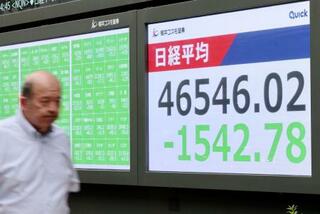 下げ幅が一時1500円を超えた日経平均株価を示すモニター=14日午後、東京都中央区