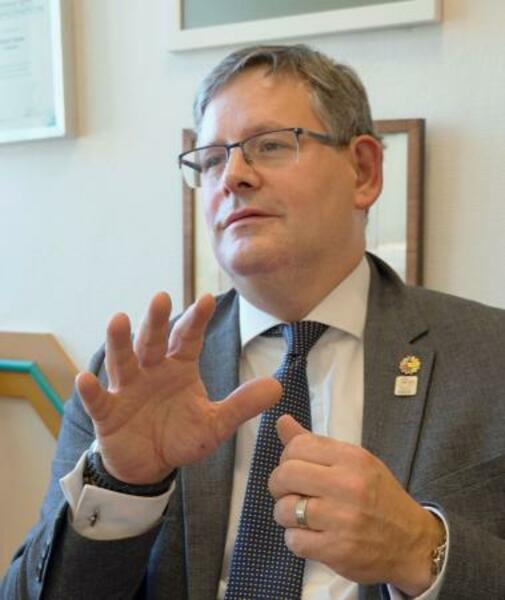 手話を使い取材に応じる、聴覚障害者の国際スポーツ大会「デフリンピック」を主催する国際ろう者スポーツ委員会(ICSD)のアダム・コーサ会長=ブダペスト(共同)