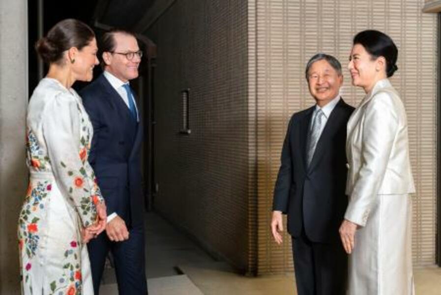スウェーデンのビクトリア皇太子と夫を出迎えられる天皇、皇后両陛下=14日夜、皇居・御所(宮内庁提供)