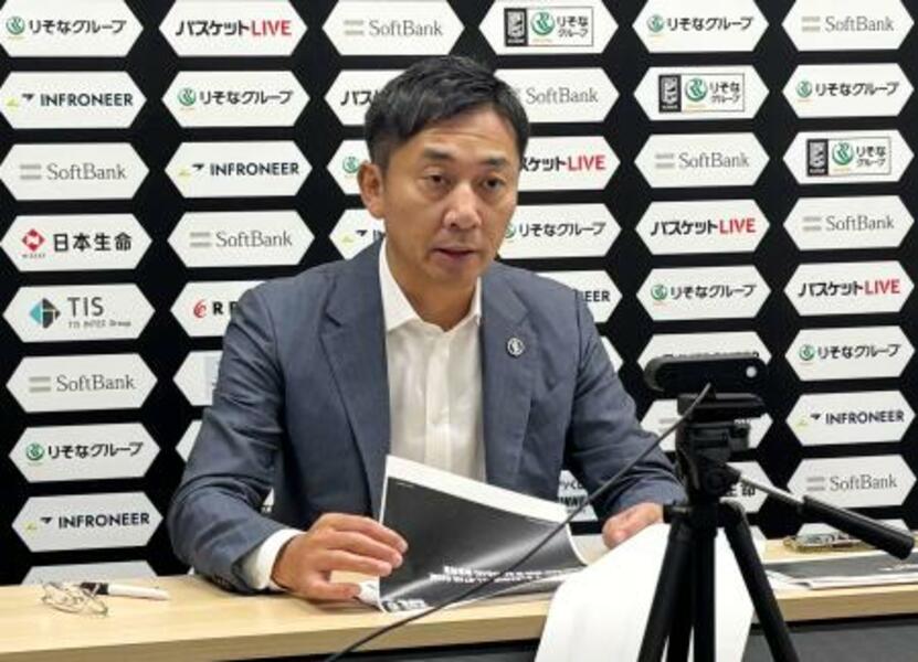 記者会見するBリーグの島田慎二チェアマン=14日、東京都文京区