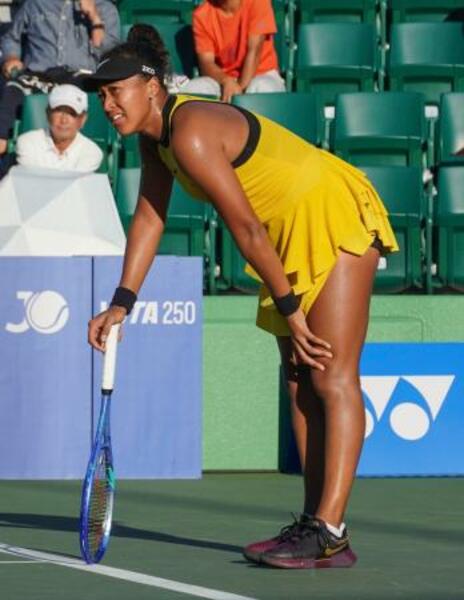 シングルス2回戦 第3セットの途中で左太ももを痛め、顔をしかめる大坂なおみ=モリタTCうつぼ
