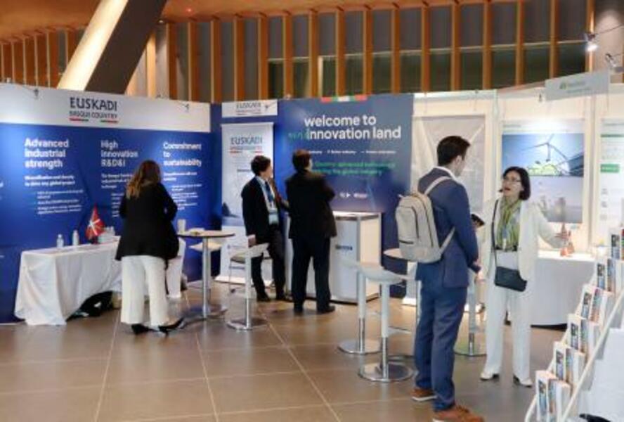 「世界洋上風力サミット」で取り組みや技術を紹介する展示ブース=15日午後、秋田市