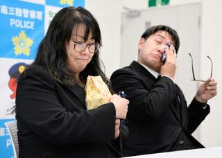 宮城県警南三陸署で、娘の山根捺星さんの遺骨を受け取り抱きしめる母の千弓さん。右は兄の大弥さん=16日午後