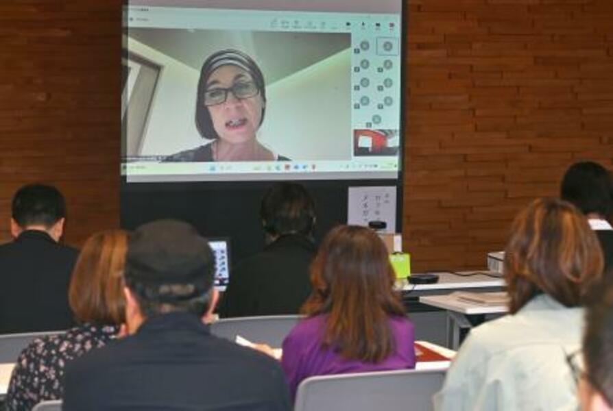 輪島塗の海外展開に関して、オンラインで講演するイタリア・ミラノ大のロッセッラ・メネガッツォ准教授=17日午後、石川県輪島市