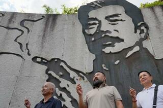 魯迅の壁画前でたばこを手に記念撮影をする人たち=9月、中国浙江省紹興市(共同)