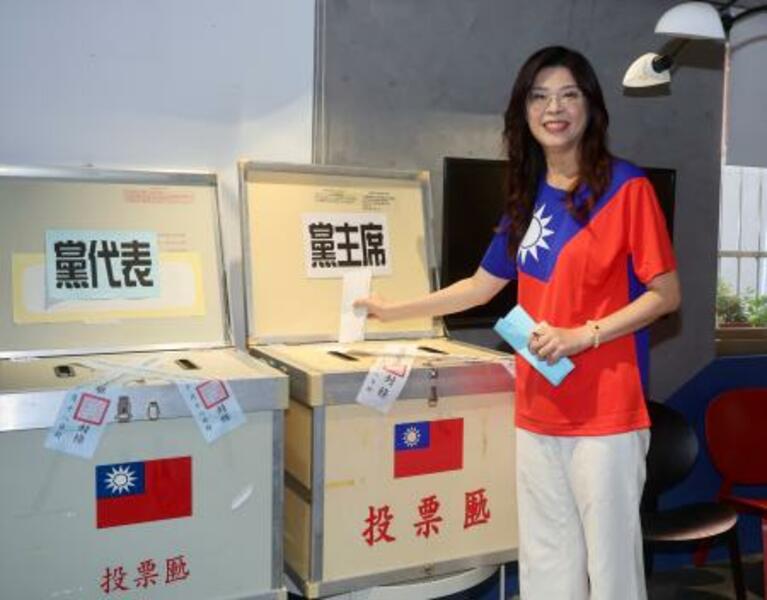 18日、台北市内で投票する鄭麗文氏(中央通信社=共同)
