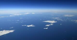 北海道・根室半島の納沙布岬(左下)沖に広がる北方領土。歯舞群島(中央)、色丹島(右上)、国後島(左奥)。はるか右奥にうっすらと択捉島が見える