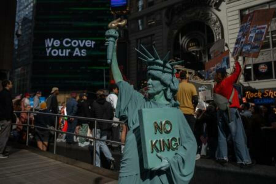 18日、自由の女神像に扮し米ニューヨークで「NO KINGS(王はいらない)」に参加した人(AP=共同)