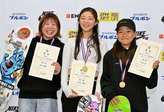 表彰式で笑顔を見せる女子優勝の長谷川瑞穂(中央)、2位の岡本碧優(左)、3位の佐竹晃=ムラサキパークかさま
