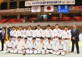 男子で2連覇を果たした東海大。右端は上水研一朗監督=兵庫県尼崎市のベイコム総合体育館