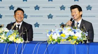 記者会見するDeNAの相川亮二新監督(左)と三浦大輔監督=20日、横浜市の球団事務所