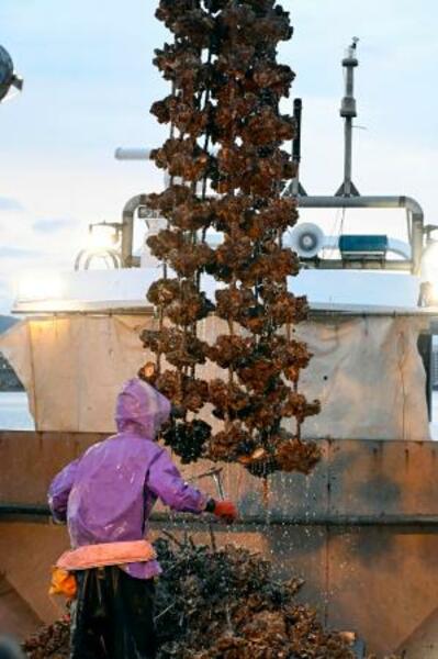 水揚げされた養殖カキ=20日早朝、広島県廿日市市