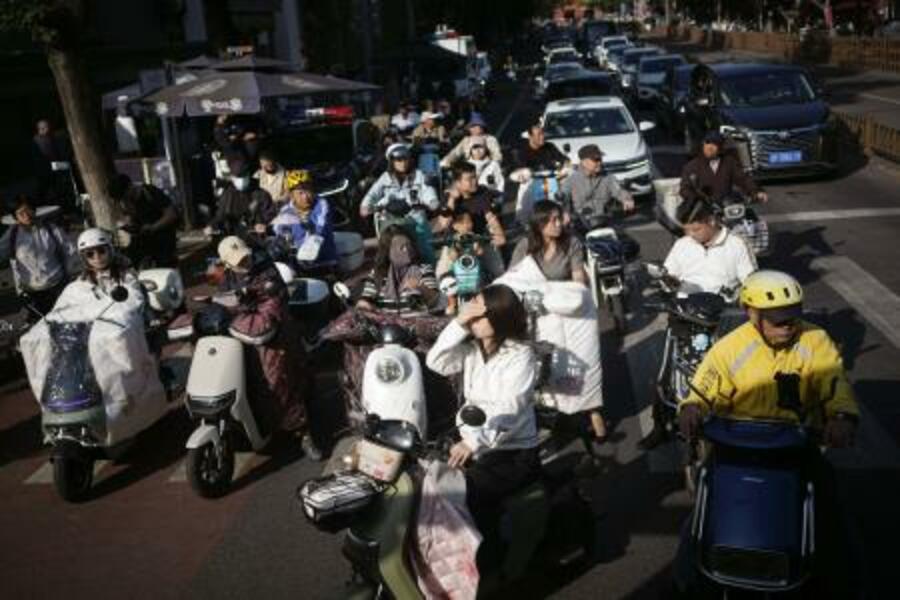 北京市内の道路で信号を待つ人たち=9月(共同)