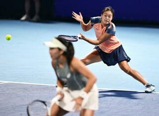 ダブルス1回戦でプレーする内島萌夏(手前)、園部八奏組=有明テニスの森公園