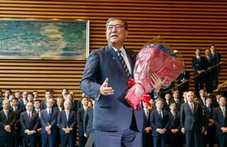 花束を手に記者団の取材に応じる石破茂首相=21日午後0時29分、首相官邸