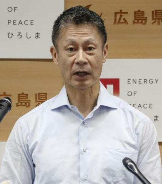 広島県庁で記者会見する湯崎英彦知事=21日午前